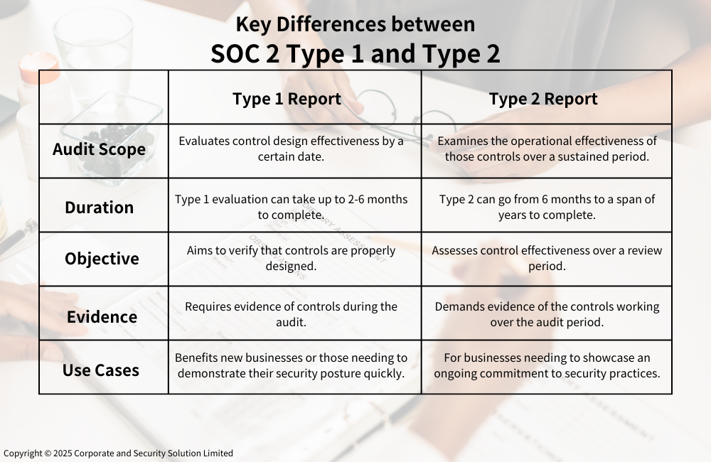 • Type 2: Assesses the operational effectiveness of those controls over a defined period.