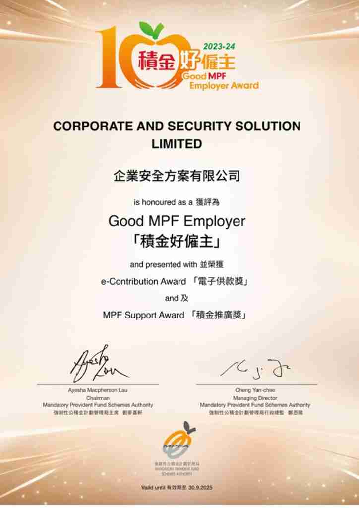 We extend our heartfelt gratitude to the Mandatory Provident Fund Schemes Authority (MPFA) for this recognition. We are honored to be a part of this initiative that promotes excellence in employee welfare and corporate social responsibility.