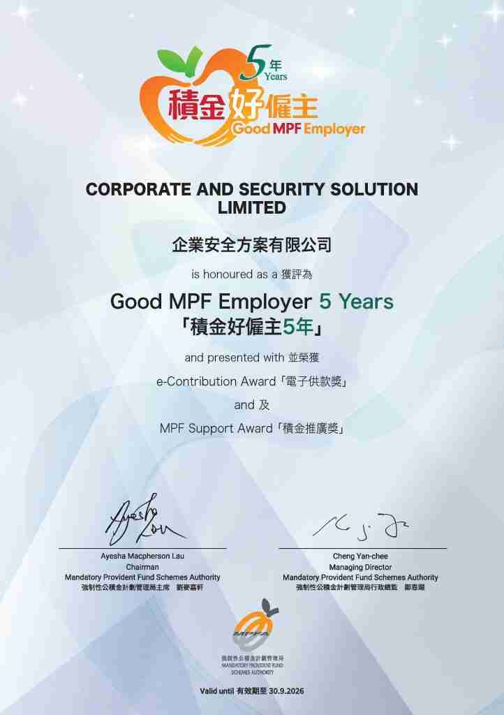 At CASSolution, our dedication to our employees goes beyond mere compliance. We strive to create a holistic environment that nurtures both professional growth and personal well-being. This award not only recognizes our efforts but also reinforces our commitment to Environmental, Social, and Governance (ESG) standards. By integrating these principles into our workplace culture, we aim to foster sustainable practices that benefit both our employees and the broader community. Achieving the “Good Employer for MPF 5-Year Award” underscores our responsibility to advocate for ethical practices, ensuring that our employees feel valued and supported while contributing positively to society.