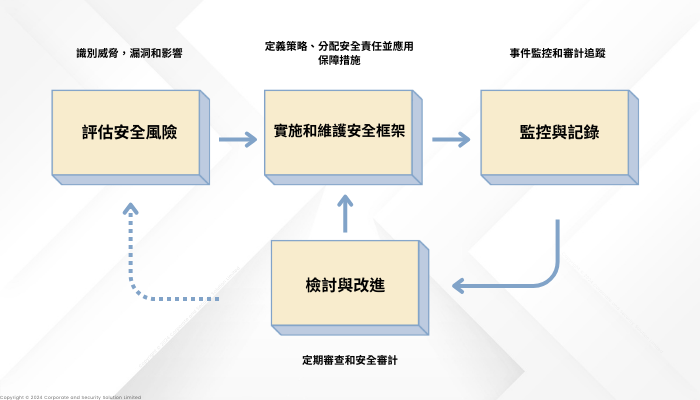 安全風險評估 識別漏洞並評估相關風險 告知管理層基於風險的安全計劃然後透過控制、策略和分配的職責的安全框架實施適當的保護。對營運和活動的持續監控支援事件處理,同時 確保持續合規定期審查和重新評估透過識別審計中的改進、提供持續回饋來確保控制滿足不斷變化的需求 應對不斷變化的威脅 透過這個週期性的風險管理過程。